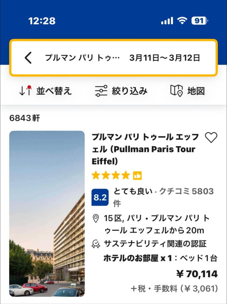 ところがこれをBookingのトップ画像に設定すると、スマホ表示では左右がトリミングされ、肝心のエッフェル塔が切れてしまう──なんてことが起きます。以下は同じホテルをスマホで確認した時の画像です。