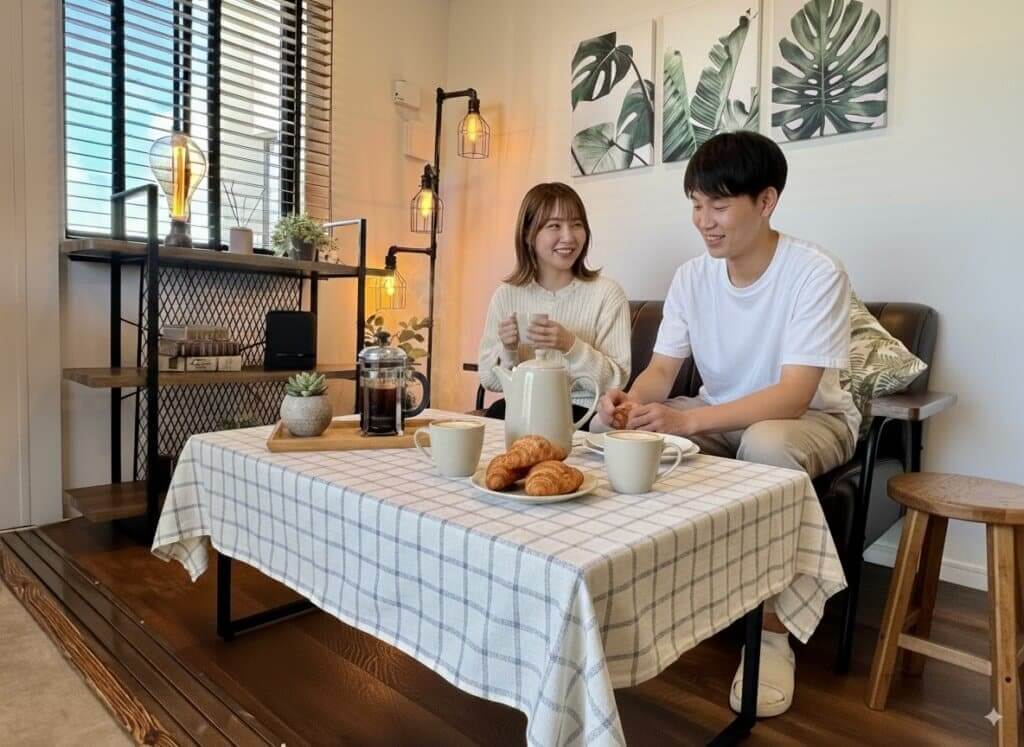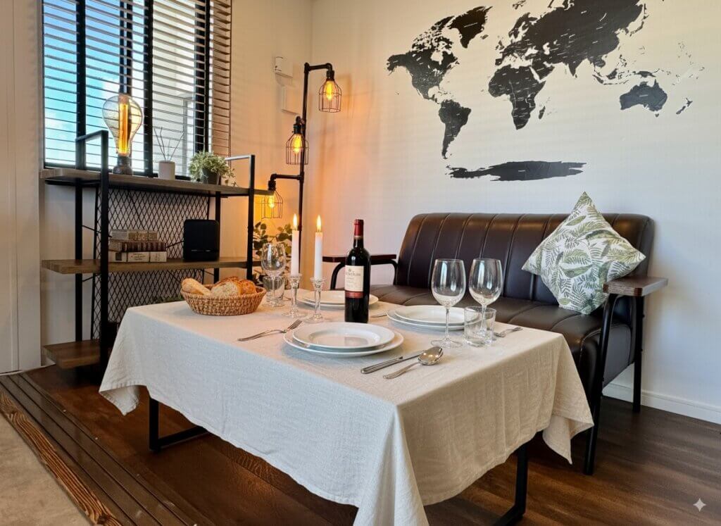 民泊やホテルの撮影でプロのカメラマンに依頼すると、色々とテーブルデコレーション用のお皿やナイフ、お花等のアイテムを持ってきてくれてリビングを華やかに撮影してくれます。