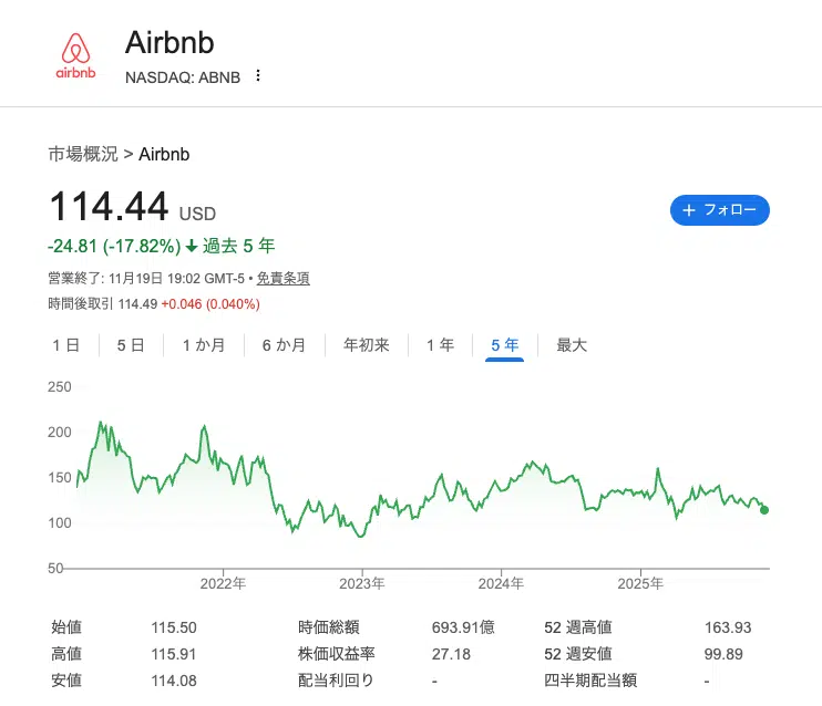 Airbnbは事業の成長力の割に株価が横ばいで振るわないので今後の伸び代が期待できそうです。