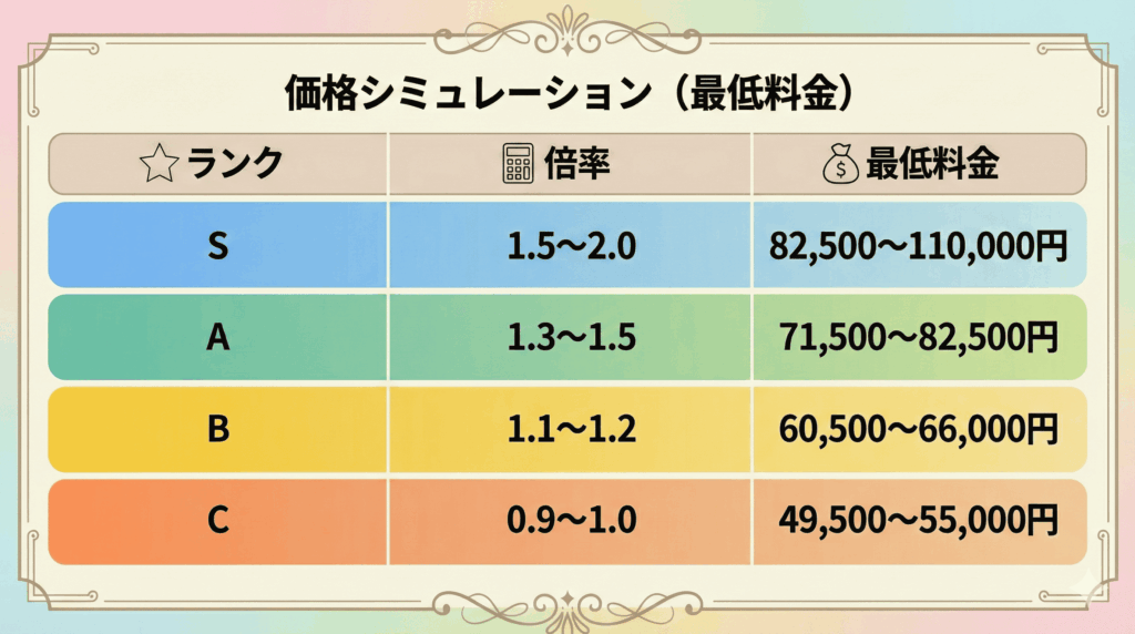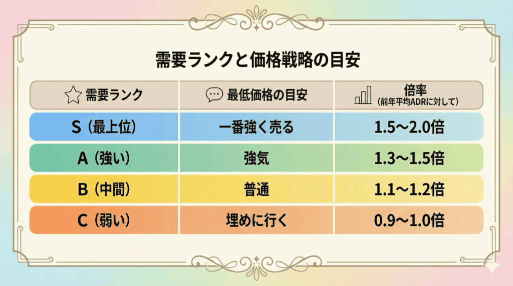 ①日並びを需要ランクに変換 → ②ランクごとの倍率を決定 → ③最低価格に落とし込む
