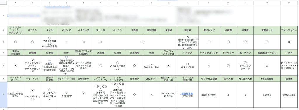 弊社では複数のホテルをサポートしているため、各宿ごとに用意しているGoogleスプレッドシートがあります。それには以下のような情報が網羅されています。