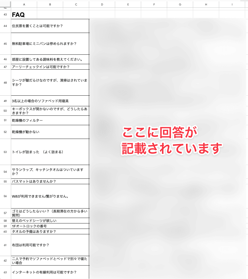 弊社ではこのようなスプレッドシートを一つの宿につき1ページ作成し、ゲストから問い合わせがあるたびにスタッフが確認して問い合わせに対応していました。
