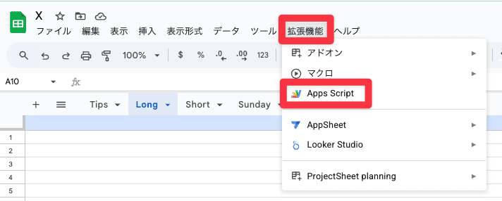 - 上部メニューにある 拡張機能>App Script をクリック