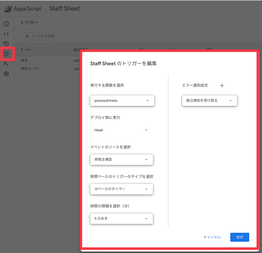App Script左側にある時計マークから「トリガー」を5分おきに設定すれば5分ごとに自動でメールをチェックして未処理のメールがあれば返信文を作成してくれます。
